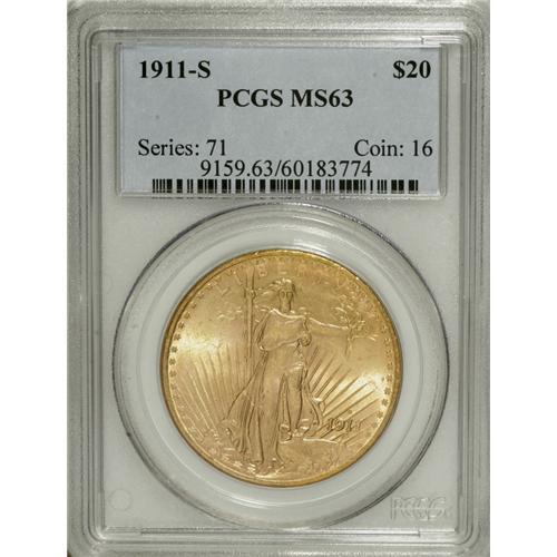 1911-S $20 MS63 PCGS. This attractive example has ligh