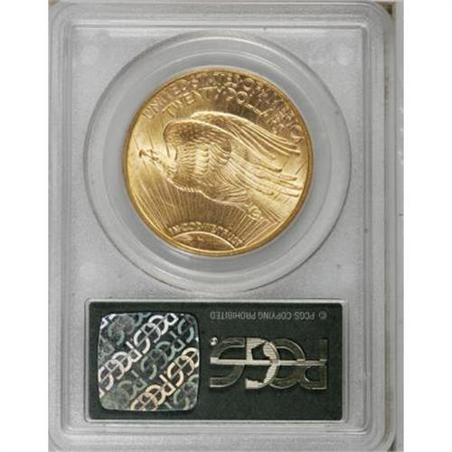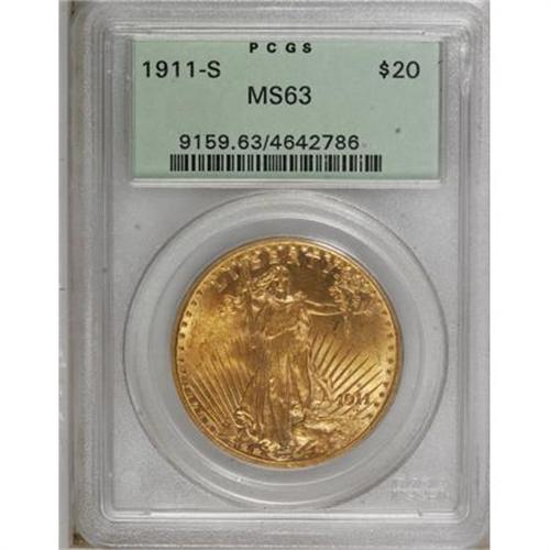 <B>1911-S $20 MS63 PCGS.</B></I> This orange-gold Saint-Gaudens twenty gives the initial impression of a finer grade. Further study locates a couple of minor marks on the sun, and a small hit to the left of the branch stem. Encased in a green label holder.<BR><BR><B>Coin Engraver:</B> Augustus Saint-Gaudens<BR><BR><b>Shipping:</b> Coins & Currency (<a target="_blank" href="http://www.heritageauctions.com/common/shipping.php">view shipping information</a>)