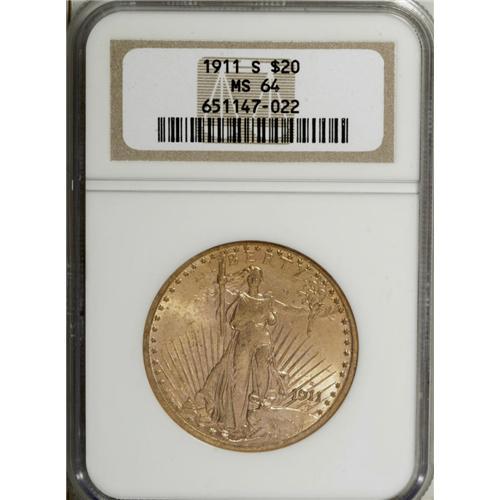 1911-S $20 MS64 NGC. This subtly lustrous apricot-gold