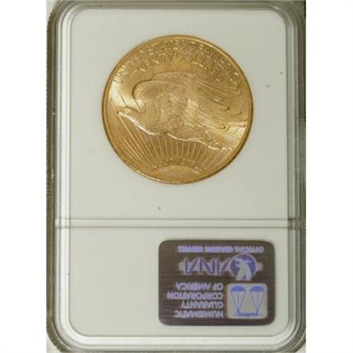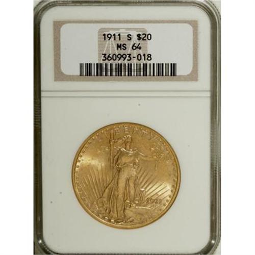 <B>1911-S $20 MS64 NGC.</B></I> This S-mint piece displays 46 stars around the obverse and the same number of stars on the edge, a number that would change to 48 as the continental United States took on its present-day form. A well struck near-Gem that offers soft, pleasing luster and displays few marks in the yellow-gold fields.<BR><I>From The Vanek Collection.</B></I><BR><BR><b>Shipping:</b> Coins & Currency (<a target="_blank" href="http://www.heritageauctions.com/common/shipping.php">view shipping information</a>)