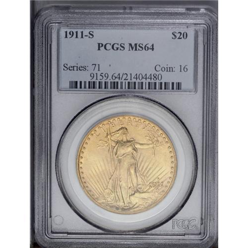 1911-S $20 MS64 PCGS. A nicely struck yellow-gold piec