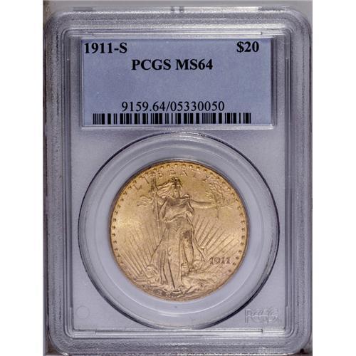 <B>1911-S<$20> MS64 PCGS.</B></I> A pleasing example. A sharp strike complements the enticing honey-gold color, and examination under magnification shows only a few grade-consistent abrasions. <BR><BR><B>Important notice:</B> Heritage usually auctions material at the rate of 200-250 lots per hour. On some occasions eBay Live bid software or the Internet may not be able to keep up with the pace of the auction. We recommend placing a realistic absentee bid now as insurance to avoid disappointment. Occasionally the auctioneer may eliminate or reject an eBay Live bid, and the auctioneer may also reopen a lot after the close of the eBay live bidding (usually because we missed an audience bid), and may reject your bid even if it shows you as the winning bidder. By bidding via eBay Live, you agree that Heritage may award the lot to another bidder at its sole discretion under the circumstances described above or any other reasonable circumstances. Since eBay bids are not shown to us until we open the lot on the floor, we treat those bids just like floor bids. In most cases the floor responds before the eBay bid is presented to us, due to Internet lag time, so for consistency we have made it a policy that floor bids are always considered first over tie eBay live bids. Also please note that all Heritage lots purchased through eBay Live carry a 20% Buyer's Premium. Please make sure you read the Terms and Conditions before you bid. This lot is being auctioned in conjunction with a live floor auction by Heritage Galleries & Auctioneers. All final auction and invoice information will be supplied by Heritage Galleries & Auctioneers, and all other information should be considered preliminary. Lot:4615 <BR><BR><B>Winning Notification and Billing:</B> After the FINAL session in this auction is complete, Heritage will send e-mail and snail mail invoices. This process normally takes several days. All final auction and invoice information will be supplied by Heritage Galleries & Auctioneers, and all other information should be considered preliminary. <BR><BR>This auction will be conducted on a live auction floor and over the Internet through eBay Live. If you choose to place an absentee bid, please take a moment to <font color='#0000ff'><u><a href='http://pages.ebay.com/liveauctions/help/before/laabsentee.html'>learn how eBay Live absentee bidding works</a></u></font><font color='#000000'>