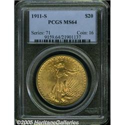 <B>1911-S $20 MS64 PCGS.</B></I> A satiny lemon-gold near-Gem, sharply struck and attractive. Gold coins still circulated in parts of the west during the teens, although late in the decade banks stopped paying out gold, due to the first World War. A speck of PVC on the reverse at 6:30 and a wispy mark above Liberty's extended arm do not distract.