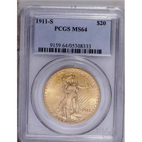1911-S $20 MS64 PCGS. A wheat-gold example, nicely str