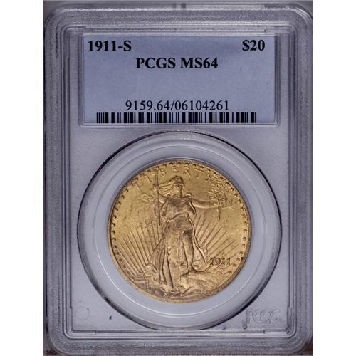<B>1911-S<$20> MS64 PCGS.</B></I> An attractive near-Gem example of this somewhat scarcer date, which becomes quite elusive at or above the Gem grade level. Mildly frosty with pleasing light coloration and few surface blemishes.