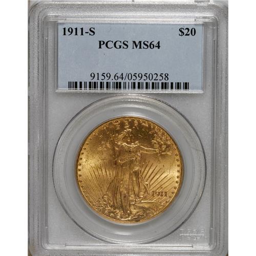 <B>1911-S $20 MS64 PCGS.</B></I> Bright satiny luster gives the matte-like surfaces a pleasingly vibrant sheen. Boldly struck with scattered marks and a couple of tiny alloy spots on the obverse.<BR><BR><b>Shipping:</b> Coins & Currency (<a target="_blank" href="http://www.heritageauctions.com/common/shipping.php">view shipping information</a>)