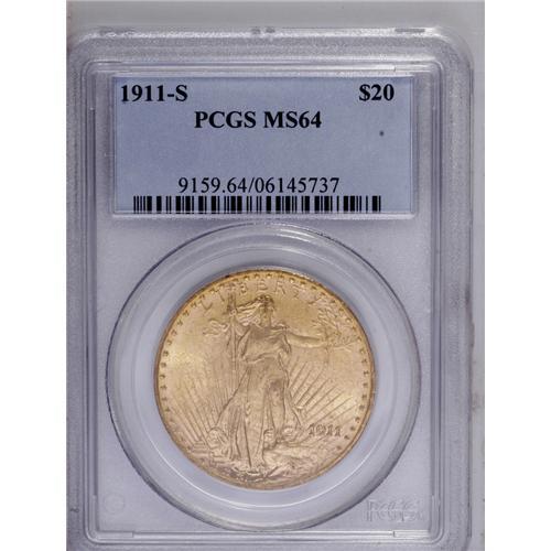 <B>1911-S<$20> MS64 PCGS.</B></I> Choice and well struck with quite lustrous gold and orange surfaces. An abrasion is noted on the obverse rim between 11 and 12 o'clock.