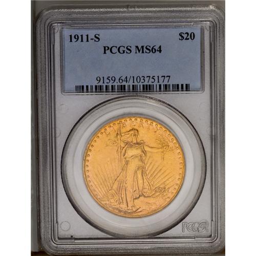 <B>1911-S<$20> MS64 PCGS.</B></I> Fine-grained honey-gold surfaces reveal pleasing luster and well executed devices. Minute marks in the left obverse field limit the grade.