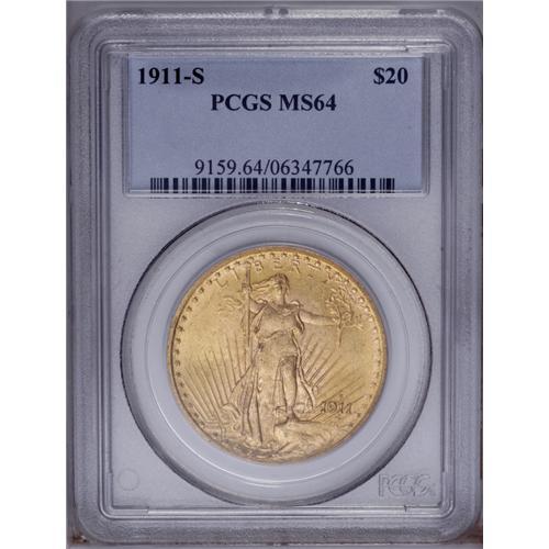 1911-S $20 MS64 PCGS. Lovely peach, olive, and apricot 1911-S[$20] MS64 PCGS.