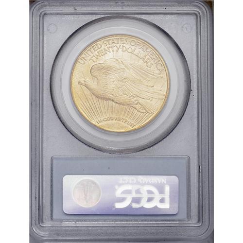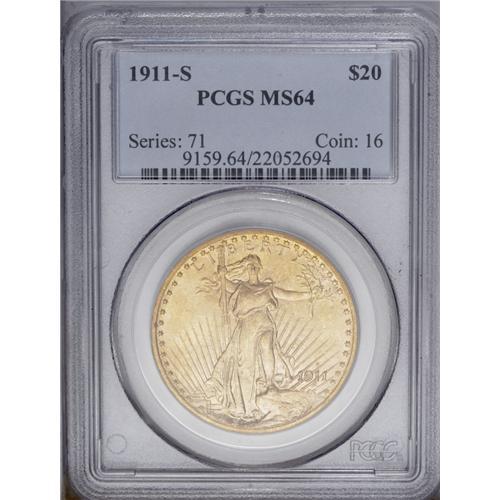 <B>1911-S<$20> MS64 PCGS.</B></I> Softly frosted mint luster radiates from the fine-grain surfaces of this pleasing reddish-gold Saint. Bold striking details are evident throughout, as a few minor abrasions on the reverse preclude the Gem designation. An attractive example of this somewhat scarcer date.