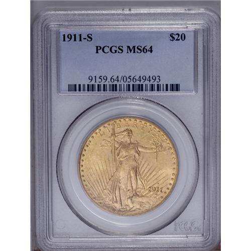 <B>1911-S $20 MS64 PCGS.</B></I> The 1911-S is another widely obtainable early Saint-Gaudens date that usually is found highly attractive, and so it is with the present piece, featuring fine-grained surfaces that vary from yellow-gold to reddish. The strike is bold, with Liberty's right (facing) leg and the Capitol building well brought up.