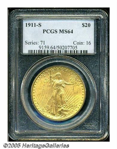 <B>1911-S<$20> MS64 PCGS.</B></I> This apricot-gold specimen has a matte-like texture and soft, glowing luster, and hints of faint green undertones. The design elements are well struck, except for slight weakness on the Capitol Building. Some minute marks are noted on Liberty's lower left leg, as well as a small area of flatness on the knee.
