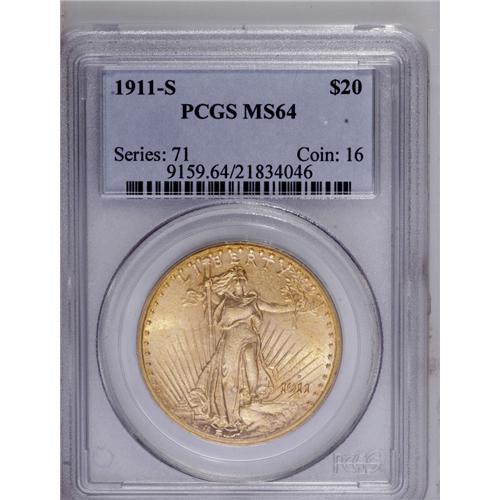 <B>1911-S<$20> MS64 PCGS.</B></I> This lemon-yellow near-Gem has fresh, original luster. A sharply struck piece with only a few minor marks that are consistent with the grade.