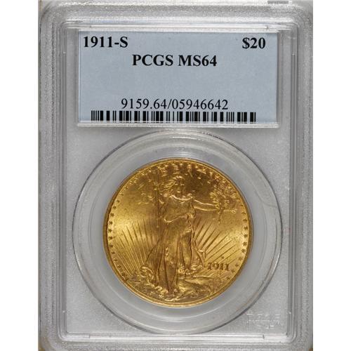 <B>1911-S $20 MS64 PCGS.</B></I> Well struck and lustrous, with the finely granular surface textures that were noted by David Akers in 1988. This piece may have been part of the Central American hoard that emerged in 1983, producing several hundred high grade examples.<BR><BR><b>Shipping:</b> Coins & Currency (<a target="_blank" href="http://www.heritageauctions.com/common/shipping.php">view shipping information</a>)