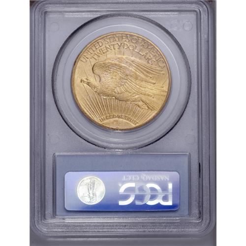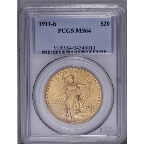 <B>1911-S $20 MS64 PCGS.</B></I> Well struck with pleasing golden-orange color and only the shallowest of surface marks. A handful of small alloy spots are noted in the right obverse field. Tantalizingly close to Gem quality.