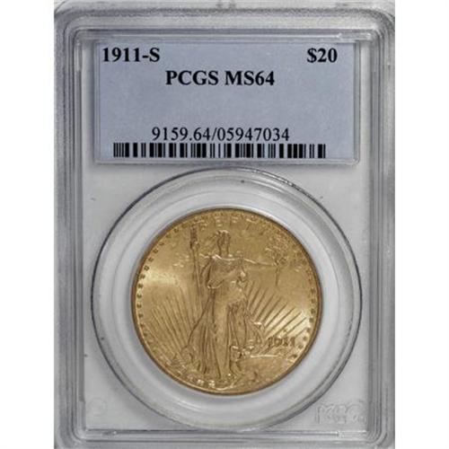 <B>1911-S $20 MS64 PCGS.</B></I> Frosty and bright, with yellow-gold toning and a normal number of minor abrasions for the grade. The surfaces have a finely granular texture, and the devices are boldly struck. <BR><BR><b>Shipping:</b> Coins & Currency (<a target="_blank" href="http://www.heritageauctions.com/common/shipping.php">view shipping information</a>)