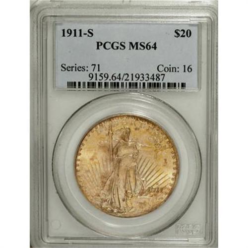 <B>1911-S $20 MS64 PCGS.</B></I> Straw-gold and yellow-gold converge on this shining near-Gem. The former is more prevalent on the well struck obverse, while the latter dominates the reverse. A pleasing S-mint double eagle.<BR><BR><B>Coin Engraver:</B> Augustus Saint-Gaudens<BR><BR><b>Shipping:</b> Coins & Currency (<a target="_blank" href="http://www.heritageauctions.com/common/shipping.php">view shipping information</a>)