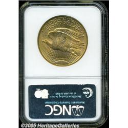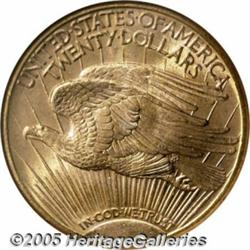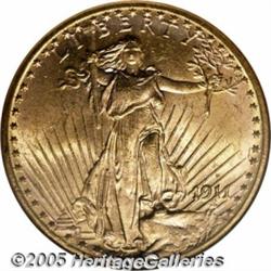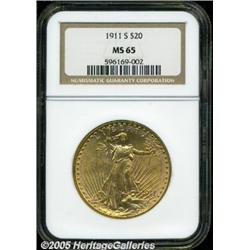 <B>1911-S $20 MS65 NGC.</B></I> Highly lustrous orange-gold surfaces with faint pinkish toning. This is a lovely Gem quality example, and it is virtually as nice as any on the market. The surfaces have the typical finely granular or matte appearance that is similar to every known example. The frosty luster is far finer than usually seen. Population: 207 in 65, 23 finer (2/05).