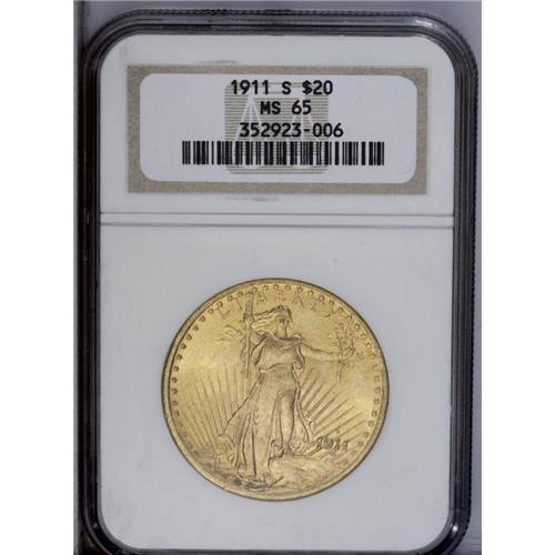 <B>1911-S<$20> MS65 NGC.</B></I> Readily obtainable in all grades except Gem, this is an understandably important 1911-S double eagle. Lustrous and fresh, the golden-rose surfaces do not reveal any distractions of note. Sharply struck, this coin has the eye appeal of an MS66 grade.