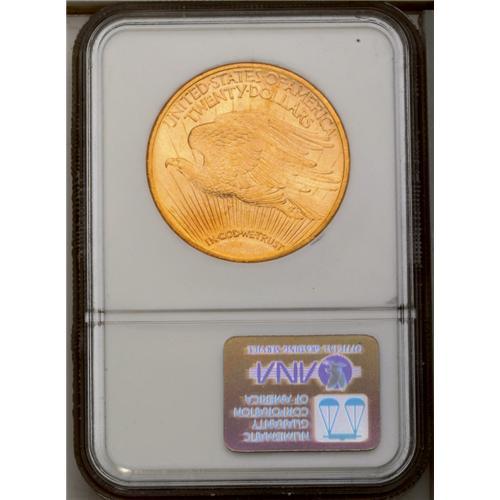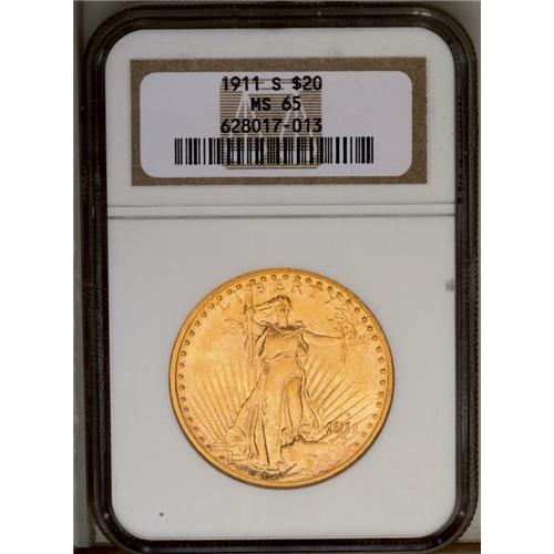 <B>1911-S<$20> MS65 NGC.</B></I> Vivacious cartwheel sheen and wisps of radiant peach-gold toning ensure the quality of this imposing Gem. The major devices are sharply struck, and the Capitol building also has crisp detail. Luster grazes are related to just one of the eagle's feathers. A desirable example of this conditionally scarce early Saint-Gaudens date.