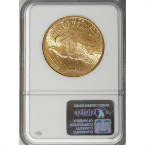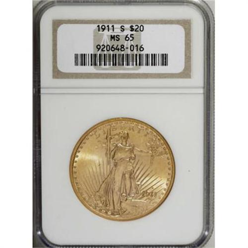 <B>1911-S $20 MS65 NGC.</B></I> Sharp design details, extraordinary mint frost, and lovely lemon color combined to create a stunning Gem that will surely elicit spirited bidding. There are few marks on either side of this example. Although considered a relatively common date, examples are scarce at the Gem level, and seldom seen any finer with only 35 better ones graded by NGC.<BR><I>From The DAX Collection.</B></I><BR><BR><B>Coin Engraver:</B> Augustus Saint-Gaudens<BR><BR><b>Shipping:</b> Coins & Currency (<a target="_blank" href="http://www.heritageauctions.com/common/shipping.php">view shipping information</a>\)