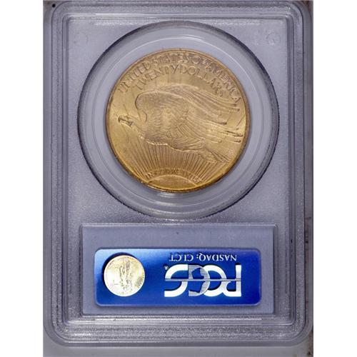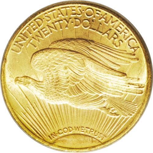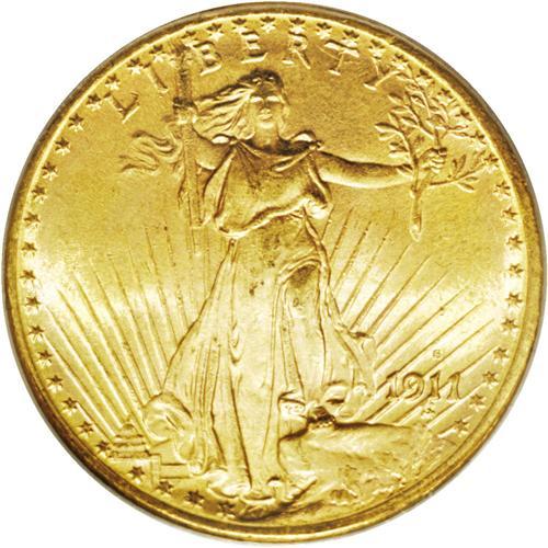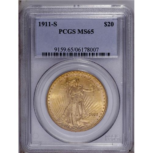 <B>1911-S<$20> MS65 PCGS.</B></I> Although readily available in lower Mint State grades, the population of accurately graded Gem examples of the 1911-S drops off sharply, to about one-fifth of the total survivors in MS64. This pleasing coin has radiant luster emanating from the fine-grained, reddish-gold surfaces. There are few visible abrasions, even under a loupe. Population: 185 in 65, 17 finer (1/06).