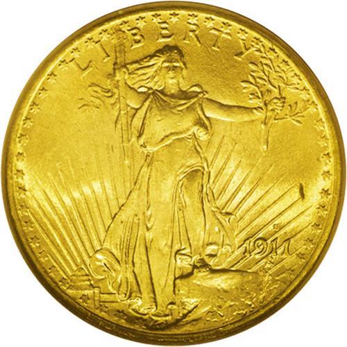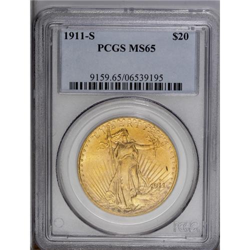 <B>1911-S<$20> MS65 PCGS.</B></I> An exquisite Gem Saint-Gaudens twenty that has original, lustrous surfaces that show a fine granularity. Fully struck with superior eye appeal. One small vertical grease stain is noted above and to the right of the mintmark. A scarcer date as a Gem.