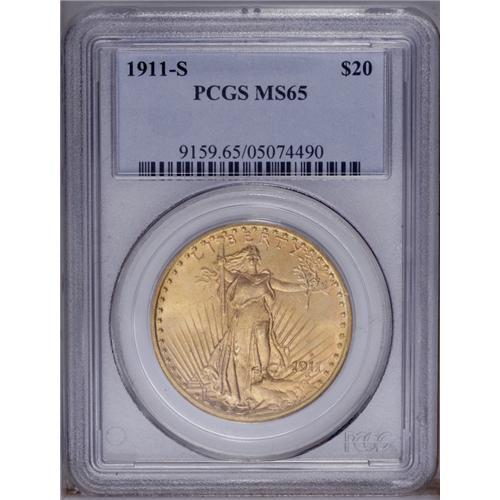 <B>1911-S<$20> MS65 PCGS.</B></I> A Gem example of this issue, lustrous and with fine-grained, reddish-gold surfaces that add a hint of hazel there and there. Pleasingly struck, although not boldly so. A coin from the year that saw the U.S. Supreme Court order the dissolution of Standard Oil as an "unreasonable monopoly" under the Sherman Antitrust Act.