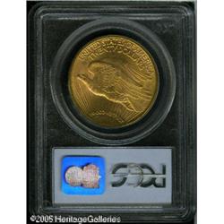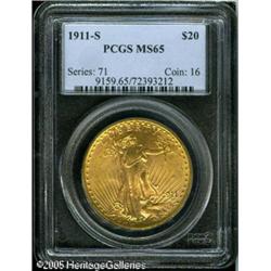 <B>1911-S $20 MS65 PCGS.</B></I> Attractive orange-gold color with strong mint luster throughout. The strike is reasonably sharp for this date and mint. However, what makes this coin really special is the quality of the surfaces, for very few examples are known in full Gem condition, and this coin is head and shoulders above virtually all others. An excellent selection for the advanced numismatist who demands top quality surfaces and strong visual appeal. Population: 110 in 65, 13 finer (1/05). Lot:9528