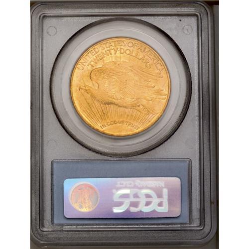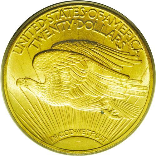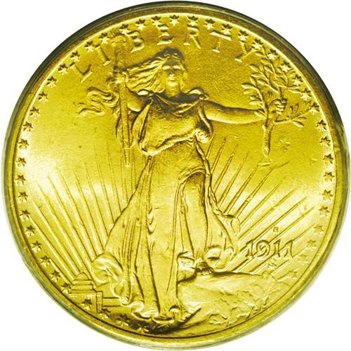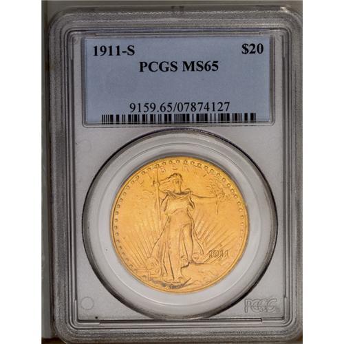 <B>1911-S<$20> MS65 PCGS.</B></I> Booming luster illuminates this attractive and carefully preserved Gem. Well struck aside from a few lower right stars. A couple of moderate marks are nearly concealed on the eagle's lower wing feathers. Although the 1911-D and the 1911-S have similar mintages, the 1911-D is much more available in better Mint State grades.