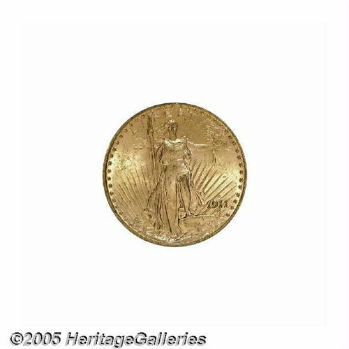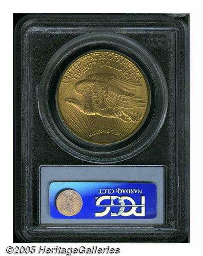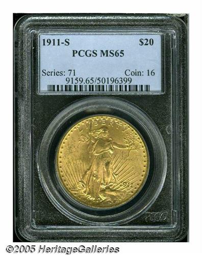 <B>1911-S<$20> MS65 PCGS.</B></I> Frosty and attractive. Most design features are sharp. Pale olive iridescence on both surfaces attests to the originality of this lovely Gem. Not an easy issue to find this nicely preserved.