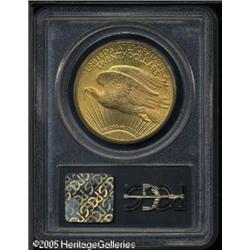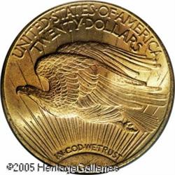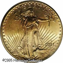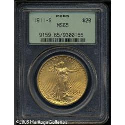 <B>1911-S $20 MS65 PCGS.</B></I> Here is a memorable coin of this date with a sharp strike and outstanding surfaces for this date and mint. Close examination will note a thin line in the field above Liberty's outstretched arm and a few tiny lines below the branch. An opportunity for the collector who desires to own a Gem specimen of this date. Population: 110 in 65, 13 finer (1/05). Lot:9527