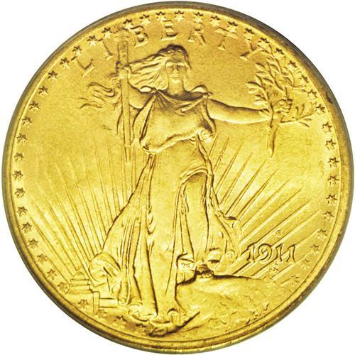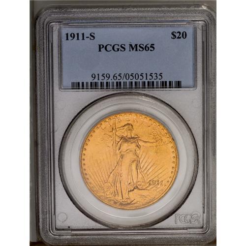 <B>1911-S<$20> MS65 PCGS.</B></I> Highly attractive with brilliant orange-gold luster and frosty surfaces. A few tiny bagmarks are present on each side, but of little significance. This is a relatively plentiful issue, even in Gem MS65 grade. David Akers mentioned a 1983 Central America hoard that including several Gem quality examples of this date.
