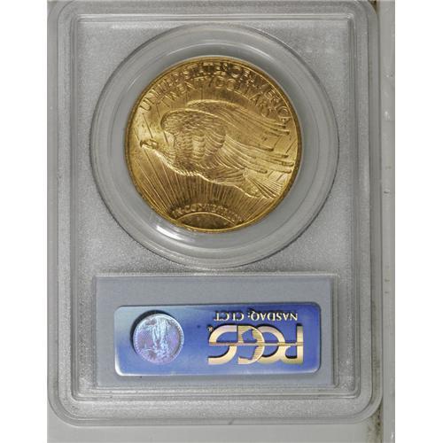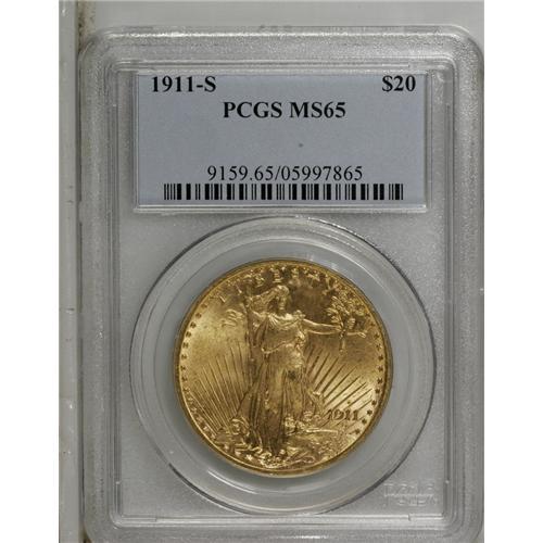 <B>1911-S $20 MS65 PCGS.</B></I> Sweeping luster and a sharp strike confirm the appeal of this tan-gold example. Liberty's knee is slightly glossy, but both sides are refreshingly void of bagmarks aside from minor contact on the left portion of the sun. A conditionally elusive issue.<BR><BR><b>Shipping:</b> Coin/Currency (<a target="_blank" href="http://www.heritageauctions.com/common/shipping.php">view shipping information</a>)