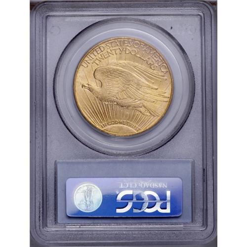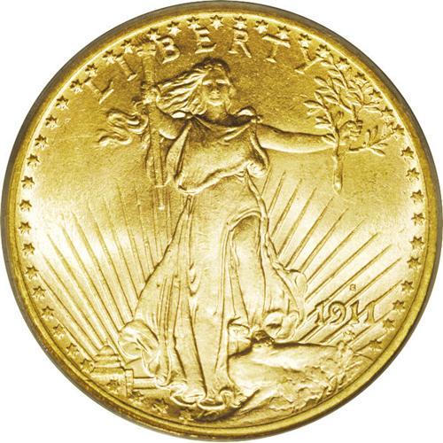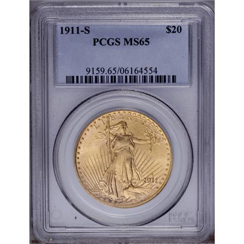 <B>1911-S<$20> MS65 PCGS.</B></I> While a Central American hoard that emerged in 1983 increased the population of low-end Mint State 1911-S double eagles, it added very few Gems to the numismatic market. The '11-S remains scarce in grades above MS64, a characteristic that it shares with the 1909-S. An obvious condition rarity, the present example displays pleasing luster effects imparted by a satin-textured finish. The yellow-gold color is rich, original, and evenly distributed over surfaces that are devoid of singularly bothersome abrasions. An attractive coin in every respect.