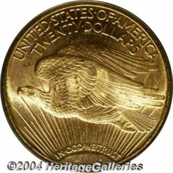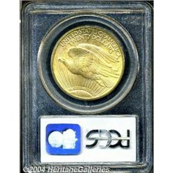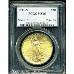 <B>1911-S<$20> MS65 PCGS.</B></I> The '11-S is scarce in grades above MS64. An obvious condition rarity, the present well struck example displays pleasing luster effects imparted by a granular finish. The orange-gold color is rich, original, and evenly distributed over surfaces that are devoid of singularly bothersome abrasions. An attractive coin in every respect. Population: 72 in 65, 8 finer (3/04). <BR><BR><B>Important notice:</B> Heritage usually auctions material at the rate of 200-250 lots per hour. On some occasions eBay Live bid software or the Internet may not be able to keep up with the pace of the auction. We recommend placing a realistic absentee bid now as insurance to avoid disappointment. Occasionally the auctioneer may eliminate or reject an eBay Live bid, and the auctioneer may also reopen a lot after the close of the eBay live bidding (usually because we missed an audience bid), and may reject your bid even if it shows you as the winning bidder. By bidding via eBay Live, you agree that Heritage may award the lot to another bidder at its sole discretion under the circumstances described above or any other reasonable circumstances. Since eBay bids are not shown to us until we open the lot on the floor, we treat those bids just like floor bids. In most cases the floor responds before the eBay bid is presented to us, due to Internet lag time, so for consistency we have made it a policy that floor bids are always considered first over tie eBay live bids. Also please note that all Heritage lots purchased through eBay Live carry a 20% Buyer's Premium. Please make sure you read the Terms and Conditions before you bid. </span></font></tr></table></td></tr></table>