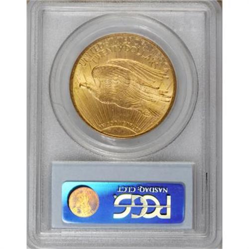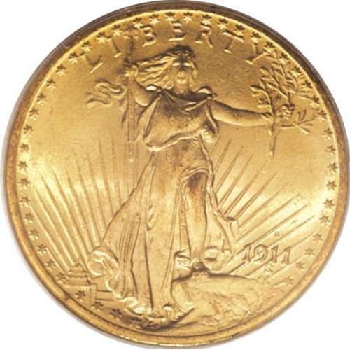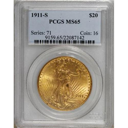 <B>1911-S $20 MS65 PCGS.</B></I> Vibrant luster and rich sun-gold toning confirm the charm of this well preserved and original Gem. The obverse center has a couple of small splashes of rose-red patina. Attentively struck and conditionally scarce. As of (5/07), only 20 pieces have been certified finer by PCGS.<BR><BR><b>Shipping:</b> Coins & Currency (<a target="_blank" href="http://www.heritageauctions.com/common/shipping.php">view shipping information</a>)