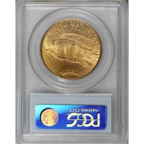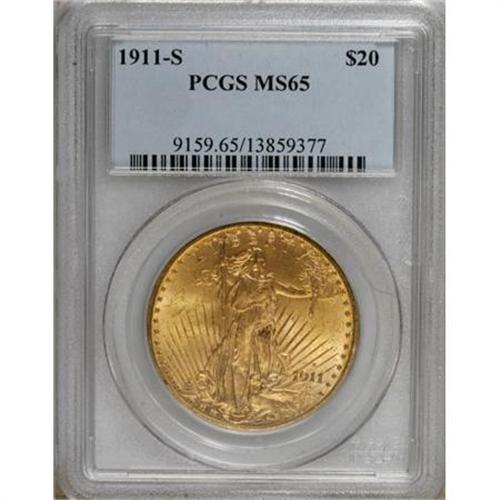 <B>1911-S $20 MS65 PCGS.</B></I> Well struck with satin luster and light yellow-gold coloration. The surfaces are free of noticeable marks. The finest collectible grade for this issue, which becomes prohibitively scarce any finer. As of (6/07), only 20 pieces have been certified at grades higher than MS65, by PCGS. <BR><BR><B>Coin Engraver:</B> Augustus Saint-Gaudens<BR><BR><b>Shipping:</b> Coins & Currency (<a target="_blank" href="http://www.heritageauctions.com/common/shipping.php">view shipping information</a>\)