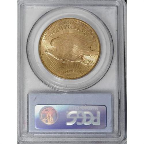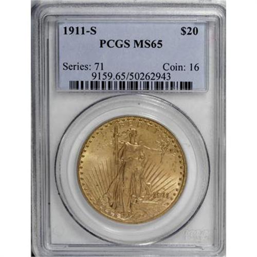 <B>1911-S $20 MS65 PCGS.</B></I> Charming peach and pale gold toning envelops this satiny and suitably struck representative. A few unobtrusive marks are present near the base of Liberty's torch, but the surfaces are attractively preserved overall. As of (6/07), PCGS has certified only 22 pieces finer.<BR><BR><B>Coin Engraver:</B> Augustus Saint-Gaudens<BR><BR><b>Shipping:</b> Coins & Currency (<a target="_blank" href="http://www.heritageauctions.com/common/shipping.php">view shipping information</a>\)