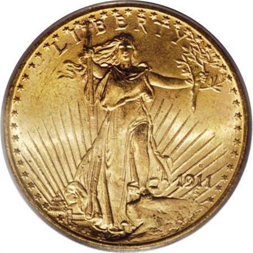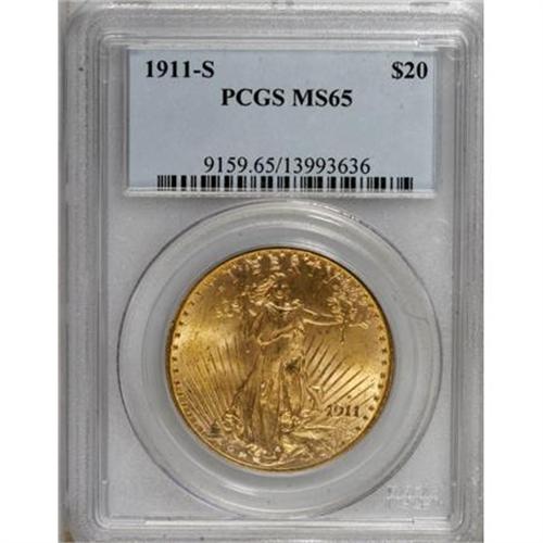 <B>1911-S $20 MS65 PCGS.</B></I> The bright, lustrous surfaces display distinctly fine-grain textures, especially on the obverse. As expected for the Gem grade level, the obverse and reverse surfaces are well preserved and free of all but a few scattered, trivial contact marks. This is a conditionally scarce issue that becomes prohibitively scarce any finer.<BR><BR><B>Coin Engraver:</B> Augustus Saint-Gaudens<BR><BR><b>Shipping:</b> Coins & Currency (<a target="_blank" href="http://www.heritageauctions.com/common/shipping.php">view shipping information</a>)