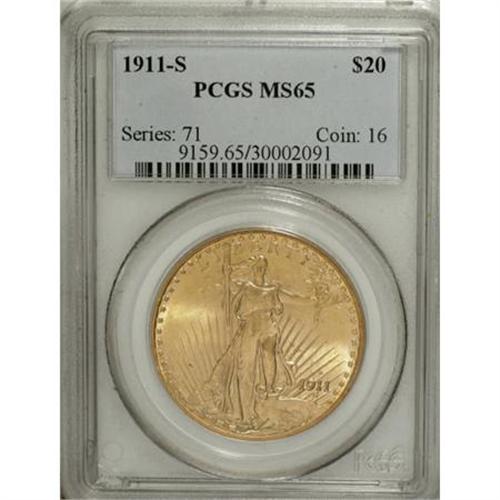 <B>1911-S $20 MS65 PCGS.</B></I> Dynamic luster and appealing honey-gold toning confirm the quality of this sharply struck and lightly abraded Saint-Gaudens twenty. The rays near the olive branch stem exhibit minor die doubling. The 1911-S was the final S-mint issue prior to Woodrow Wilson's election, since no 1912-S was struck.<BR><I>From The Parker Lee III Collection.</B></I><BR><BR><B>Coin Engraver:</B> Augustus Saint-Gaudens<BR><BR><b>Shipping:</b> Coins & Currency (<a target="_blank" href="http://www.heritageauctions.com/common/shipping.php">view shipping information</a>)