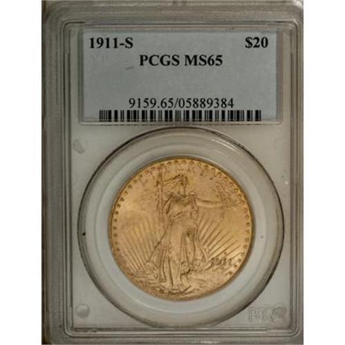 <B>1911-S $20 MS65 PCGS.</B></I> A nice Gem of this early-series, available mintmarked issue, with good luster radiating from the boldly struck apricot-gold surfaces. While the 1911-S can be found for a price in MS65, higher-grade pieces are much more elusive, by an order of magnitude according to the population reports.<BR><BR><B>Coin Engraver:</B> Augustus Saint-Gaudens<BR><BR><b>Shipping:</b> Coins & Currency (<a target="_blank" href="http://www.heritageauctions.com/common/shipping.php">view shipping information</a>)