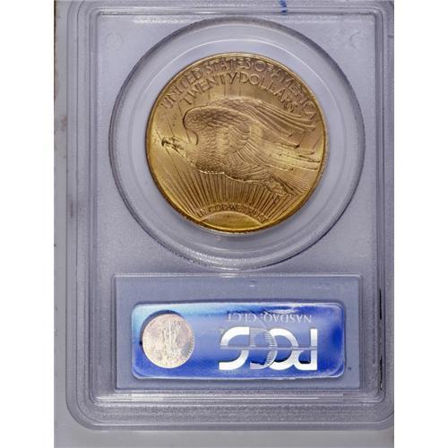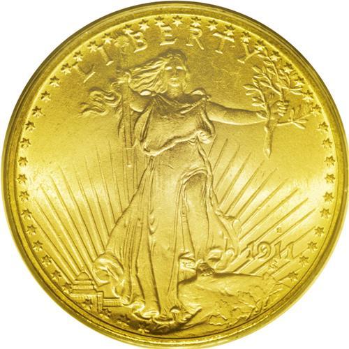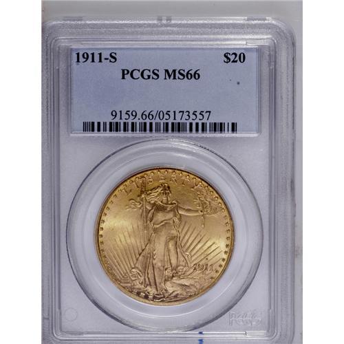 <B>1911-S<$20> MS66 PCGS.</B></I> This is an exquisitely preserved '11-S double eagle. Well defined with outstanding luster and matte-like surfaces. Flashy yellow-golden color gives a fresh appearance to this coin. Like the 1910-S, the 1911-S (775,750 pieces produced) is a common issue in lower Mint State grades that becomes scarce when one reaches the Gem grade level. At the Premium Gem level it is rare, with only 42 pieces so graded through the combined efforts of NGC and PCGS (6/06).