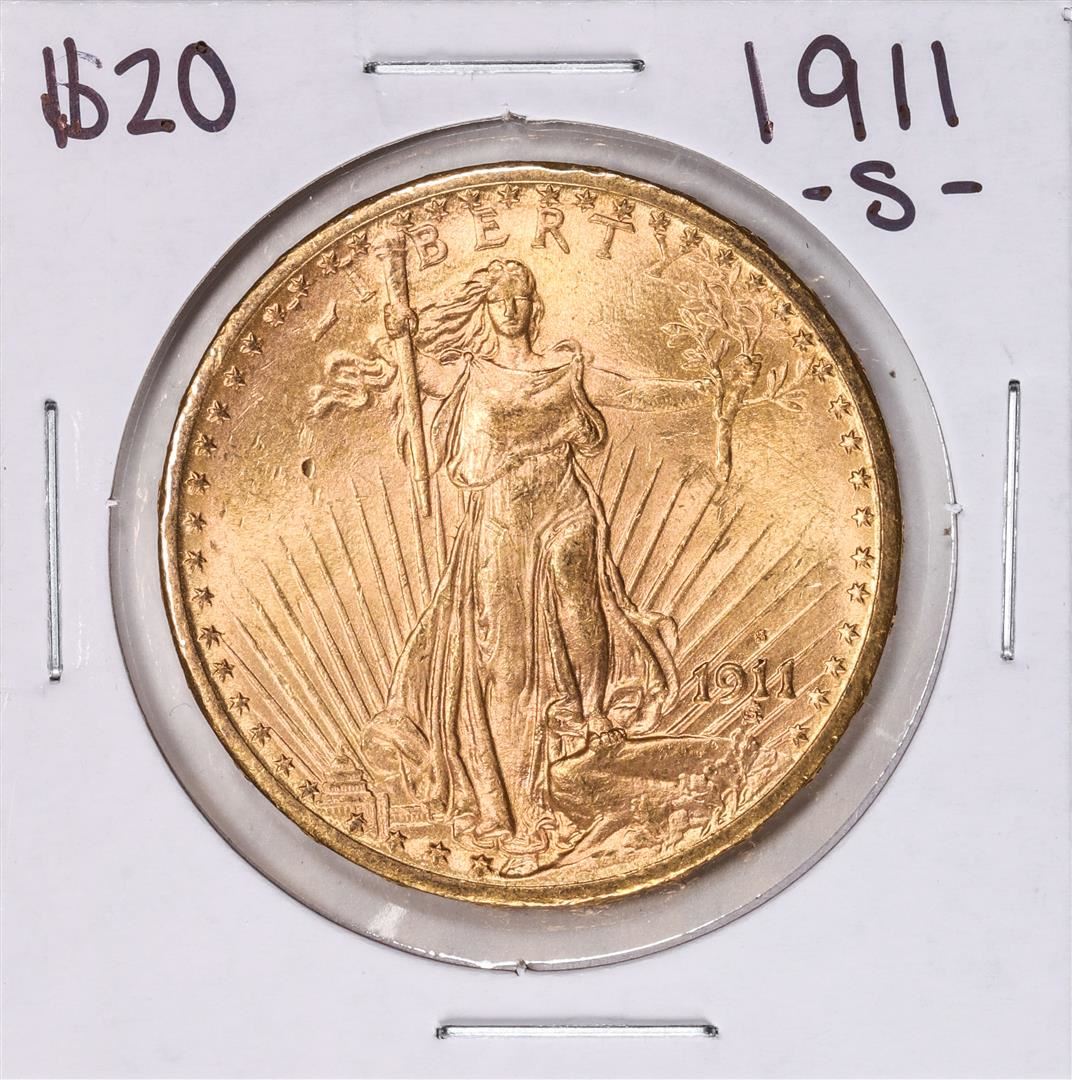 One 1911-S $20 St. Gaudens Double Eagle Gold Coin.