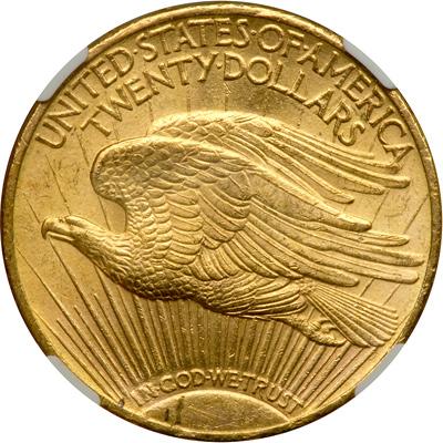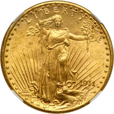 1911-S $20 St. Gaudens. NGC graded MS-64. Both sides display a hint of delicate golden toning. Glistening fields rise and fall with original mint bloom. Against this are set serious, frosty design elements. And as for the strike, it, like the luster, is outstanding. A well-struck example of the '11-S emission with sharp details. There are no bothersome copper stains or points of wear. A single minor mark on the left thigh (PCGS # 9159) .