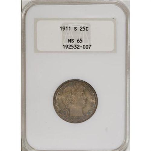 <B>1911-S 25C MS65 NGC.</B></I> Medium intensity orange-gold patina displays cobalt-blue and lavender accents on the obverse, while dusky mauve-gray dominates the reverse. A well executed strike emboldens the design elements, and both sides are well preserved. Census: 22 in 65, 17 finer (12/07).<BR><BR><B>Coin Engraver:</B> Charles E. Barber<BR><BR><b>Shipping:</b> Coins & Currency (<a target="_blank" href="http://www.heritageauctions.com/common/shipping.php">view shipping information</a>)