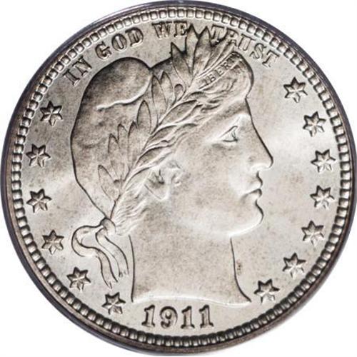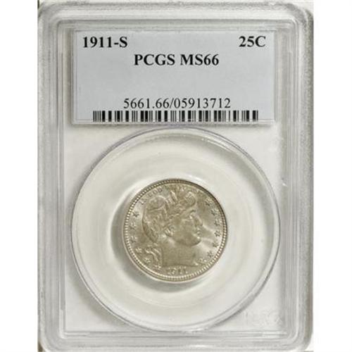 <B>1911-S 25C MS66 PCGS.</B></I> Just 988,000 of these coins were produced, placing the date in 14th position among all Barber quarters. Pristine silver surfaces are fully brilliant, and all design elements are boldly rendered. This delightful Barber quarter ranks close to the finest certified. Population: 30 in 66, 4 finer (8/07).<BR><BR><B>Coin Engraver:</B> Charles E. Barber<BR><BR><b>Shipping:</b> Coins & Currency (<a target="_blank" href="http://www.heritageauctions.com/common/shipping.php">view shipping information</a>)