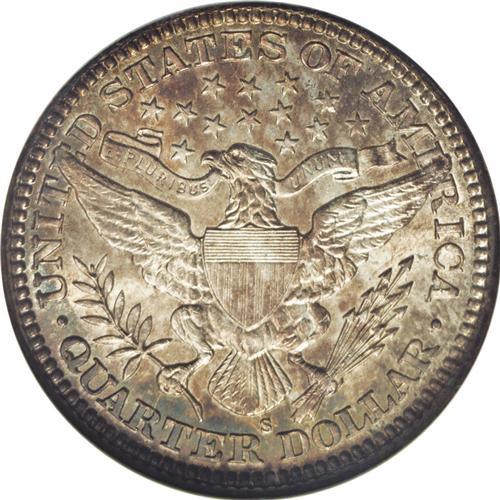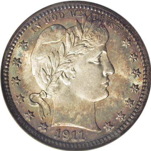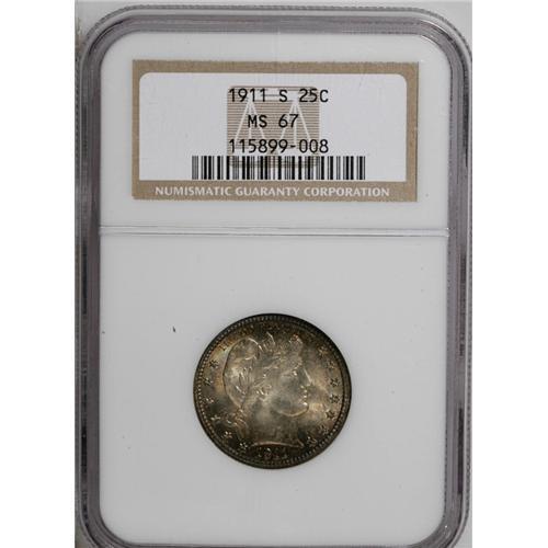 <B>1911-S<25C> MS67 NGC.</B></I> Shimmering, frosted surfaces of peerless quality are layered in golden-rose and steel-blue toning that yields to an oval-shaped area of brilliance on the obverse. A squiggly fragment on the dies can be detected below Liberty's ear, the only intrusion into the coin's silky-smooth appearance. While not quite as scarce in Mint State as its sub-million mintage would suggest, the availability of '11-S quarters at this supreme level is obviously limited. Census: 7 in 67, 1 finer (6/06).<BR><I>From The Belle Glade Collection.</B></I> <BR><BR><B>Important