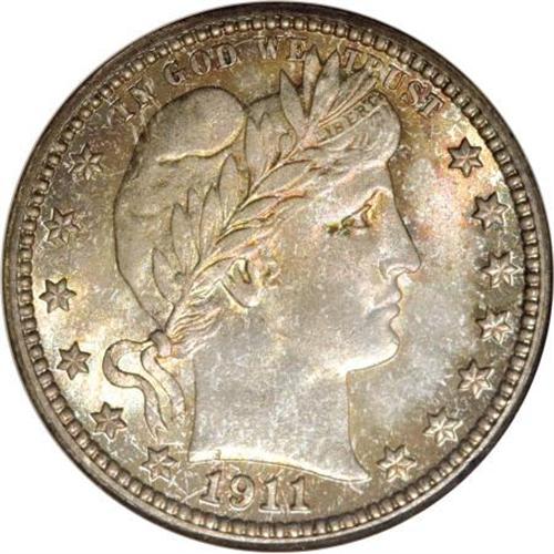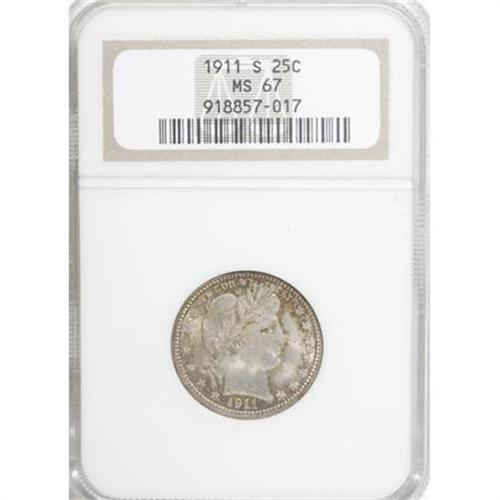 <B>1911-S 25C MS67 NGC.</B></I> Intense luster radiates from both sides of this lovely Superb Gem. A melange of pastel gold, gray, yellow, and lime-green runs over the obverse, while the reverse takes on a deeper greenish-gray hue. Sharply struck on all of the design features, with well cared for surfaces. Census: 7 in 67, 1 finer (6/07).<BR><BR><b>Shipping:</b> Coins & Currency (<a target="_blank" href="http://www.heritageauctions.com/common/shipping.php">view shipping information</a>)