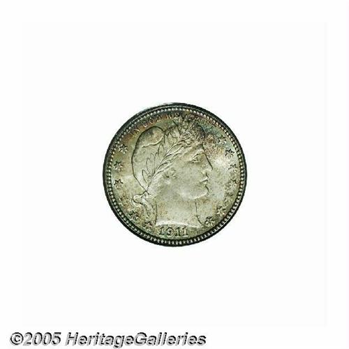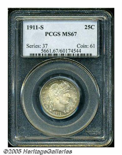 <B>1911-S<25C> MS67 PCGS.</B></I> The 1911-S is one of the more frequently encountered mintmarked late-date Barber quarters. Almost a million pieces were struck, and probably as a result of this (relatively) small mintage a higher percentage of Uncirculated coins were set aside. Predictably, this issue is anything but common in Superb condition. PCGS has only certified two other pieces in MS67 with none finer, and NGC has graded 7 in this condition with only one finer (5/05). As with many high grade '11-S quarters, this piece was struck from a polished die which imparted a lovely, bright gleam to the fields. This finish is even apparent beneath the speckled golden and rose toning that is seen over each side that deepens to crimson and thalo-blue at the margins. An exceptionally well preserved coin and unquestionably original.